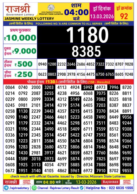 Rajshree Lottery Result 4PM 13.03.26
