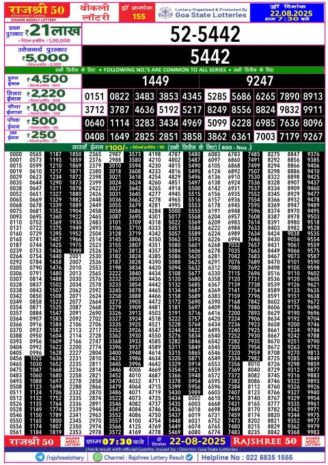 Rajshree 50 Lottery Result 7.30PM 22.08.25