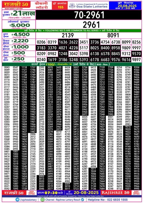 Rajshree 50 Lottery Result 7.30PM 20.08.25