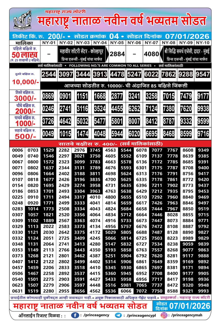 Maharashtra Natal New Year Bumper Lottery Result Today 07.01.26 Share: XFacebookPinterestRedditVKDiggLinkedinMix Related Results Maharashtra Sahyadri Monthly Lottery Result 13.01.26 Rajshree 500 Monthly Lottery Result Today 13.01.26 Rajshree Christmas Special Lottery Result 30.12.25 Maharashtra State Gajraj Monthly Lottery Result 27.12.25