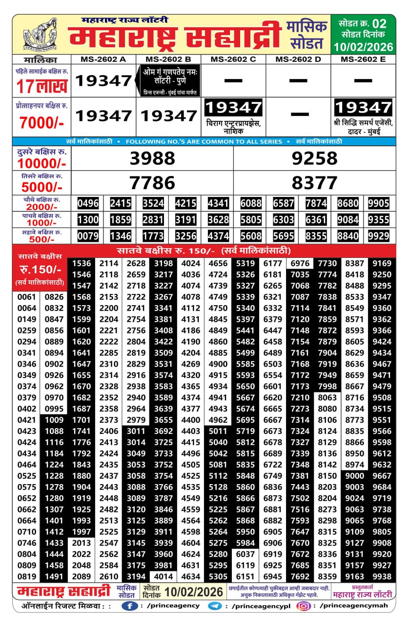 Maharashtra State Sahyadri Monthly Result 10/02/26 Share: XFacebookPinterestRedditVKDiggLinkedinMix Related Results Rajshree New Year Lohari Bumper Lottery Result 2026 Maharashtra Gajraj Monthly Result 28.01.26 Maharashtra State Tejaswini Monthly Lottery Result 23.01.26 Maharashtra State Gaurav Monthly Lottery 4pm Result 21.01.26