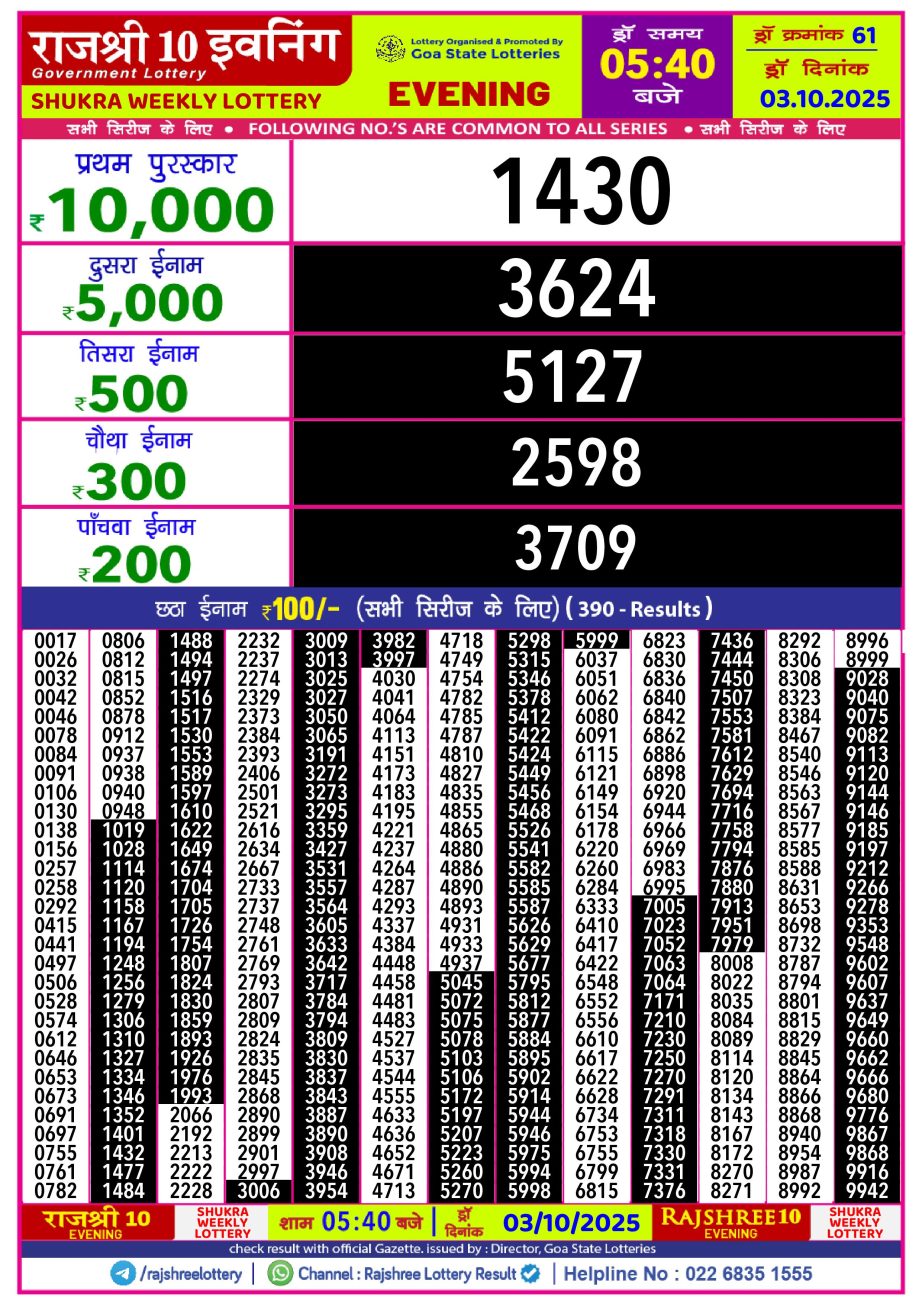 Rajshree 10 Lottery Result 5.40PM 03.10.25 Share: XFacebookPinterestRedditVKDiggLinkedinMix Related Results Rajshree 10 Lottery Result 5.40PM 13.10.25 Rajshree 10 Lottery Result 5.40PM 12.10.25 Rajshree 10 Lottery Result 5.40PM 11.10.25 Rajshree 10 Lottery Result 5.40PM 10.10.25