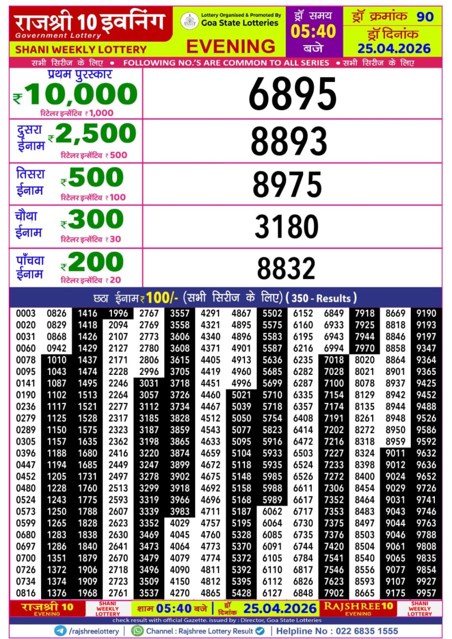 Rajshree 10 Lottery Result 5.40PM 25.04.26 Share: XFacebookPinterestRedditVKDiggLinkedinMix Related Results Rajshree 10 Lottery Result 5.40PM 01.05.26 Rajshree 10 Lottery Result 5.40PM 30.04.26 Rajshree 10 Lottery Result 5.40PM 29.04.26 Rajshree 10 Lottery Result 5.40PM 28.04.26