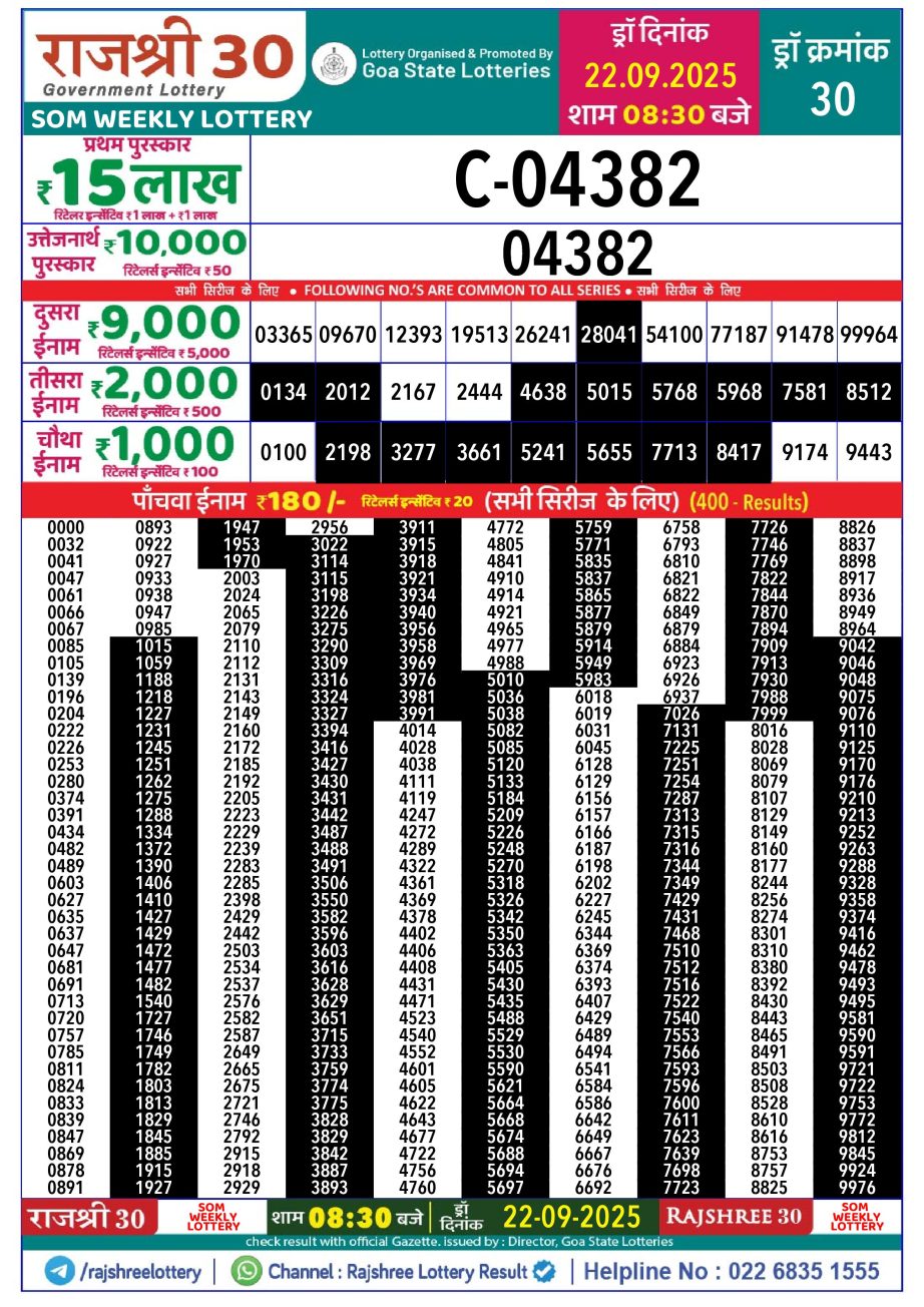 Rajshree 30 Lottery Result 8.30PM 22.09.25 Share: XFacebookPinterestRedditVKDiggLinkedinMix Related Results Rajshree Night Lottery Result 9PM 11.10.25 Rajshree Lottery Result 9PM 09.10.25 Rajshree 30 Lottery Result 8.30PM 05.10.25 Rajshree 30 Lottery Result 8.30PM 04.10.25