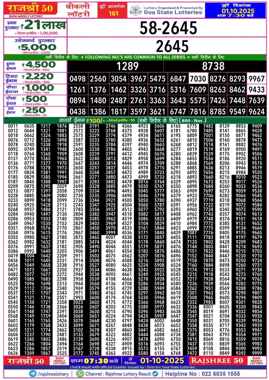 Rajshree 50 Lottery Result 7.30PM 01.10.25 Share: XFacebookPinterestRedditVKDiggLinkedinMix Related Results Rajshree 50 Lottery Result 7.30PM 14.12.25 Rajshree 50 Lottery Result 7.30PM 13.12.25 Rajshree 50 Lottery Result 7.30PM 12.12.25 Rajshree 50 Lottery Result 7.30PM 11.12.25