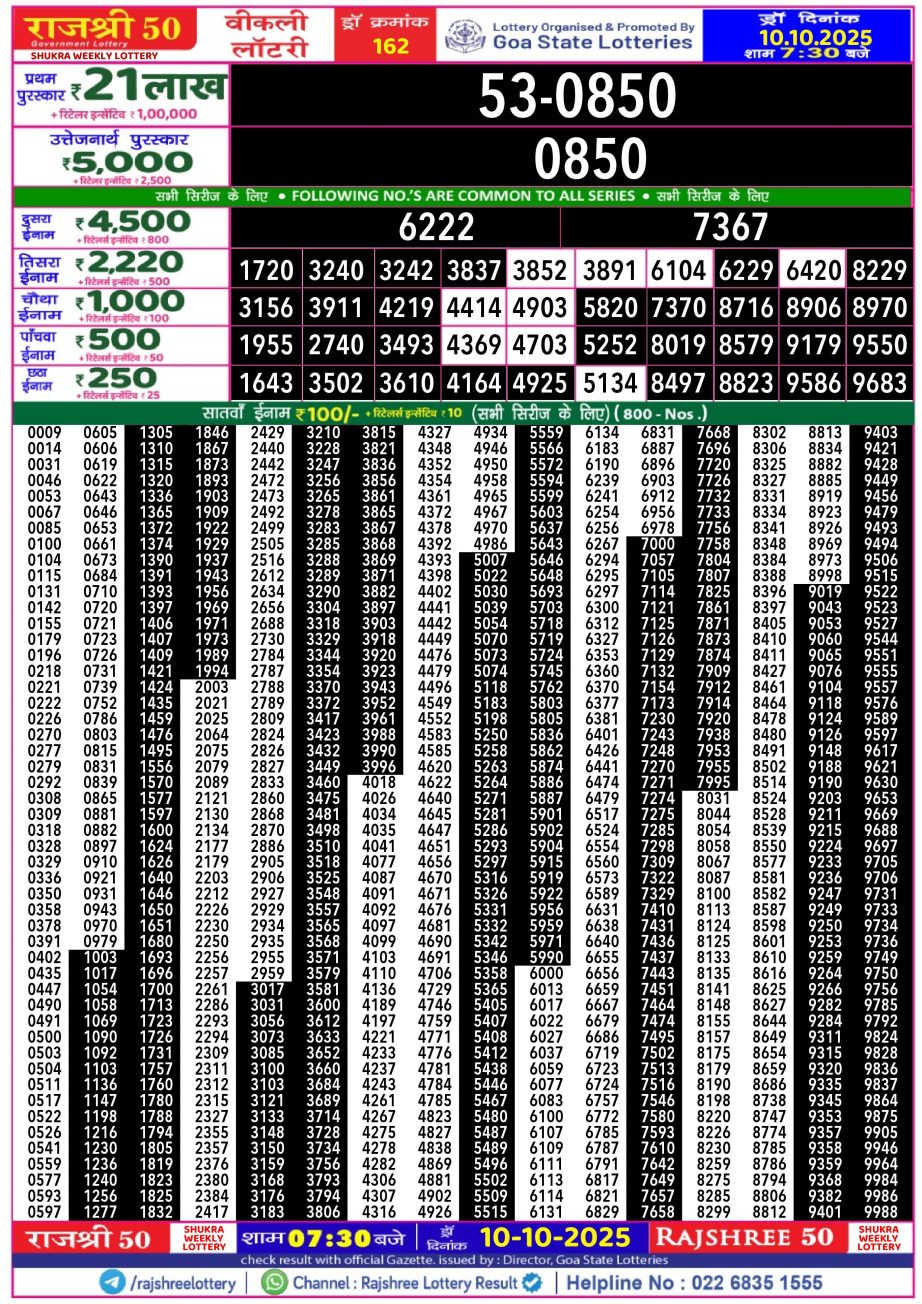 Rajshree 50 Lottery Result 7.30PM 10.10.25 Share: XFacebookPinterestRedditVKDiggLinkedinMix Related Results Rajshree 50 Lottery Result 7.30PM 13.10.25 Rajshree 50 Lottery Result 7.30PM 12.10.25 Rajshree 50 Lottery Result 7.30PM 11.10.25 Rajshree 50 Lottery Result 7.30PM 09.10.25