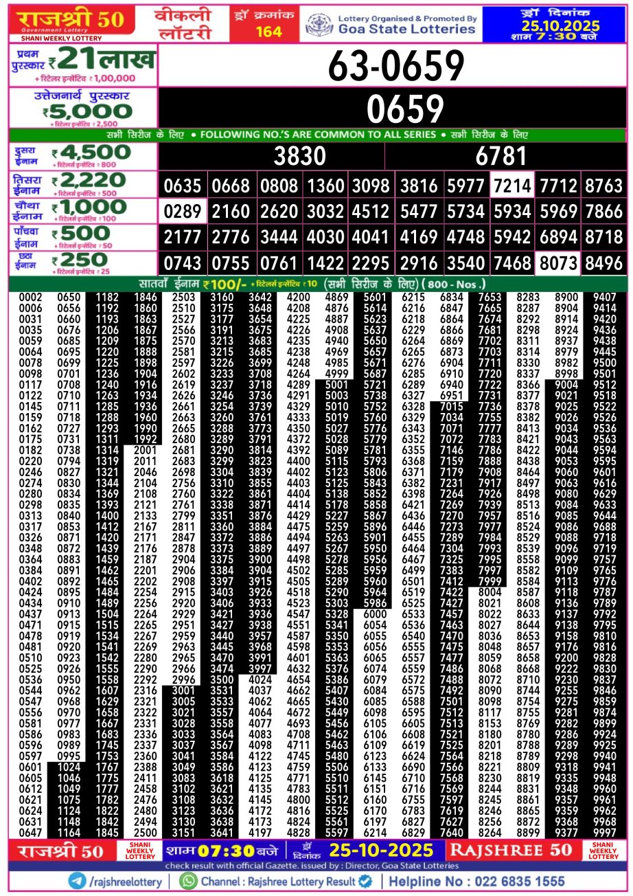 Rajshree 50 Lottery Result 7.30PM 25.10.25 Share: XFacebookPinterestRedditVKDiggLinkedinMix Related Results Rajshree 50 Lottery Result 7.30PM 14.12.25 Rajshree 50 Lottery Result 7.30PM 13.12.25 Rajshree 50 Lottery Result 7.30PM 12.12.25 Rajshree 50 Lottery Result 7.30PM 11.12.25
