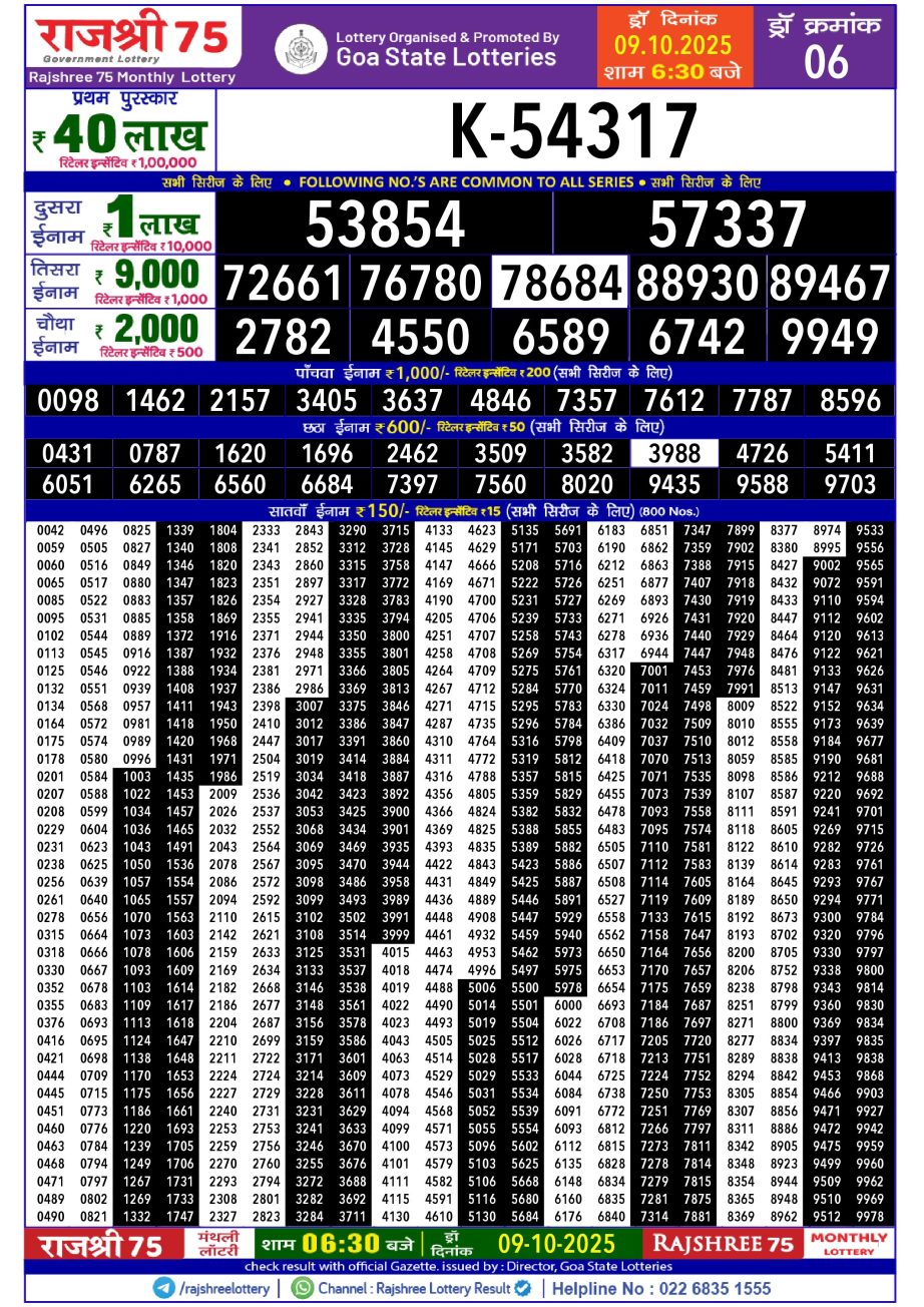 Rajshree 75 Monthly Lottery Result Today 09.10.25 Share: XFacebookPinterestRedditVKDiggLinkedinMix Related Results Rajshree 75 Monthly Lottery Result 11.09.25 Rajshree 75 monthly lottery result 14.08.25 Today Rajshree 75 monthly lottery result 10/07/25 Rajshree 75 Monthly Lottery Result 6.30pm 12/06/25