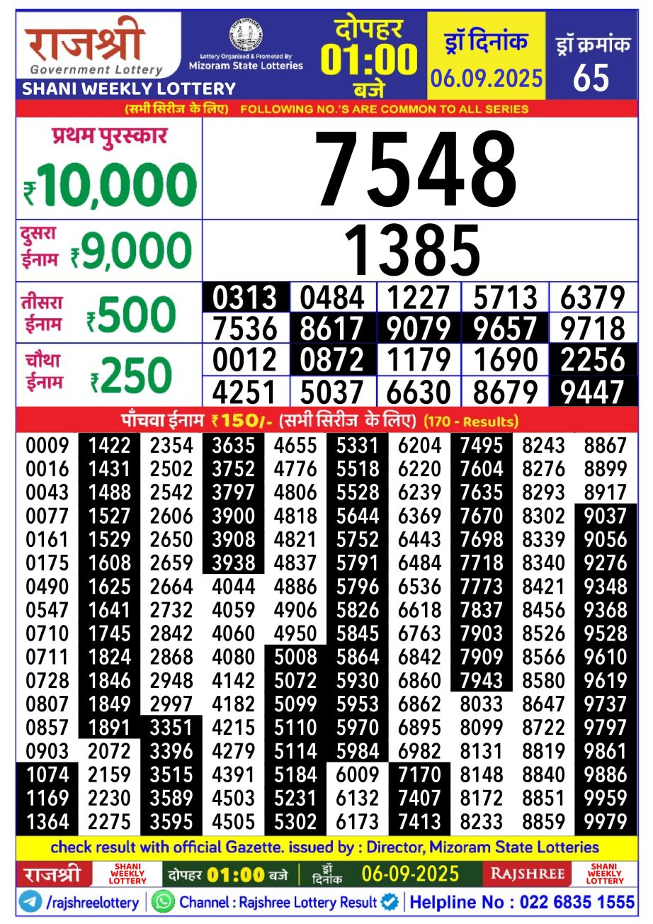 Rajshree Lottery Result 1PM 06.09.25 Share: XFacebookPinterestRedditVKDiggLinkedinMix Related Results Rajshree Lottery Result 1PM 29.10.25 Rajshree Lottery Result 1PM 28.10.25 Rajshree Lottery Result 1PM 27.10.25 Rajshree Lottery Result 1PM 26.10.25