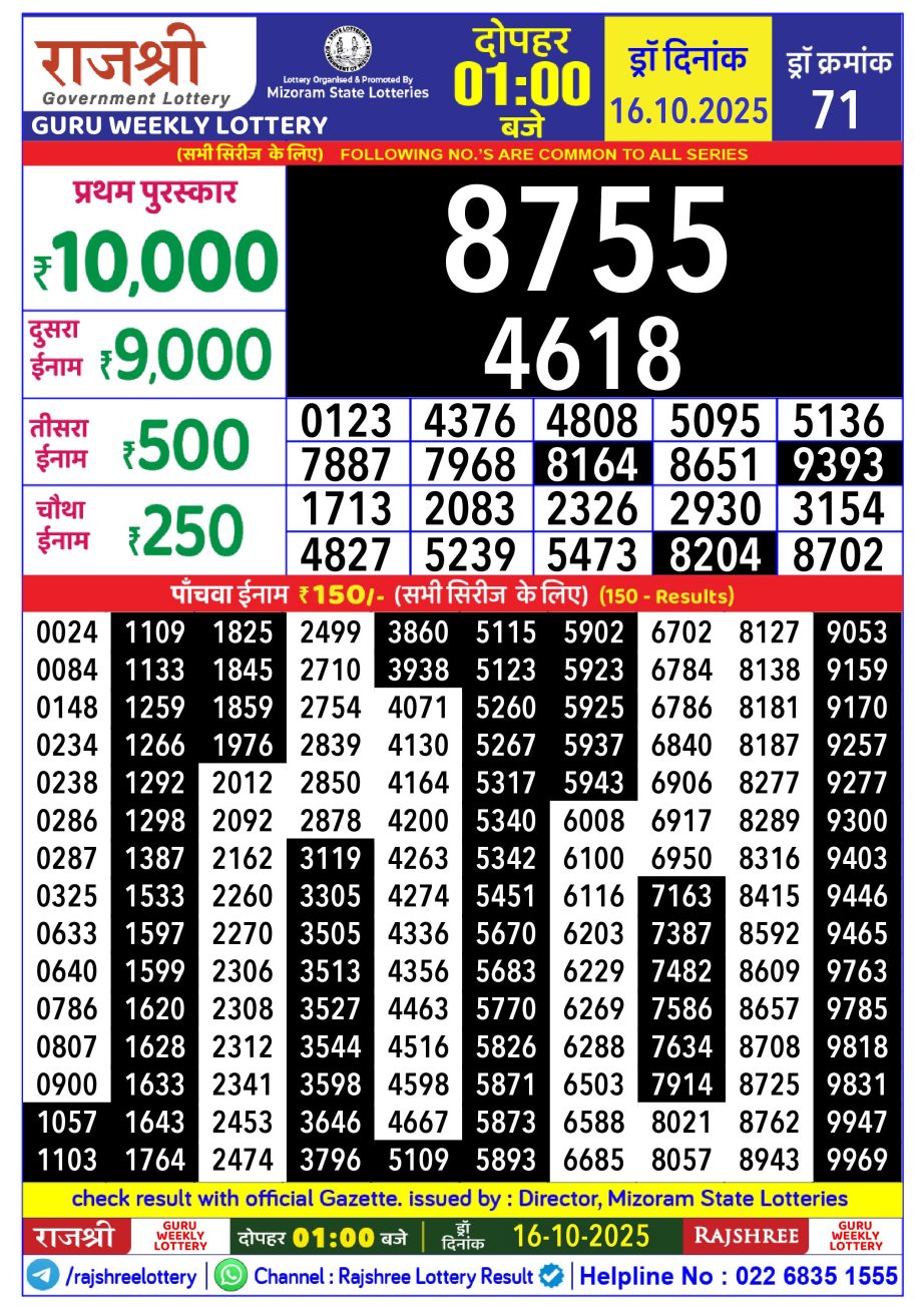 Rajshree Lottery Result 1PM 16.10.25 Share: XFacebookPinterestRedditVKDiggLinkedinMix Related Results Rajshree Lottery Result 1PM 14.12.25 Rajshree Lottery Result 1PM 13.12.25 Rajshree Lottery Result 1PM 12.12.25 Rajshree Lottery Result 1PM 11.12.25
