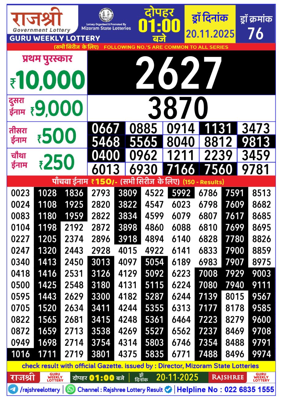 Rajshree Lottery Result 1PM 20.11.25 Share: XFacebookPinterestRedditVKDiggLinkedinMix Related Results Rajshree Lottery Result 1PM 14.12.25 Rajshree Lottery Result 1PM 13.12.25 Rajshree Lottery Result 1PM 12.12.25 Rajshree Lottery Result 1PM 11.12.25