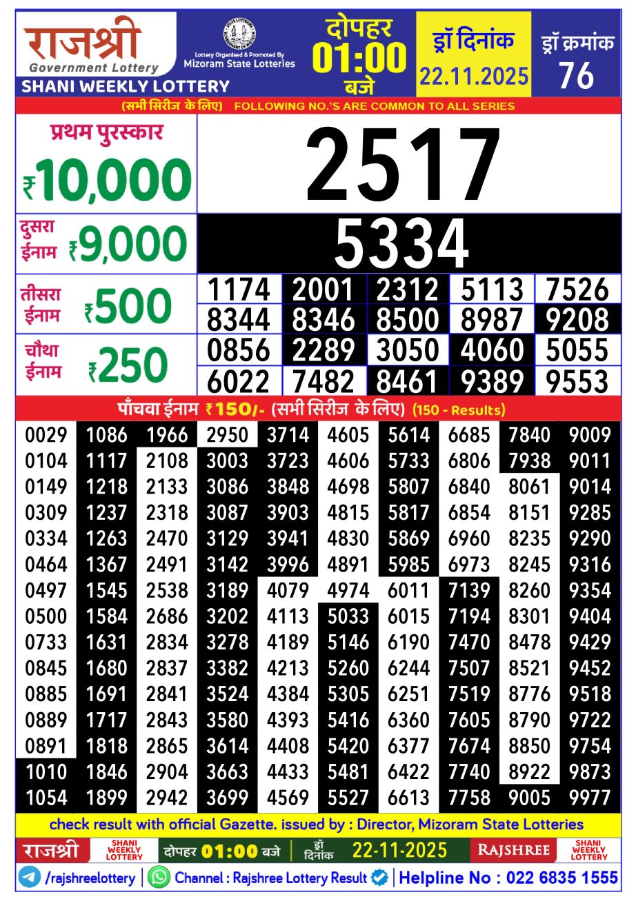 Rajshree Lottery Result 1PM 22.11.25 Share: XFacebookPinterestRedditVKDiggLinkedinMix Related Results Rajshree Lottery Result 1PM 14.12.25 Rajshree Lottery Result 1PM 13.12.25 Rajshree Lottery Result 1PM 12.12.25 Rajshree Lottery Result 1PM 11.12.25