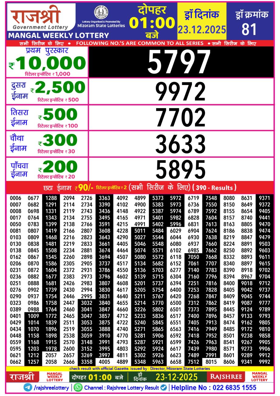 Rajshree Lottery Result 1PM 23.12.25 Share: XFacebookPinterestRedditVKDiggLinkedinMix Related Results Rajshree Lottery Result 1PM 18.01.26 Rajshree Lottery Result 1PM 17.01.26 Rajshree Lottery Result 1PM 16.01.26 Rajshree Lottery Result 1PM 15.01.26
