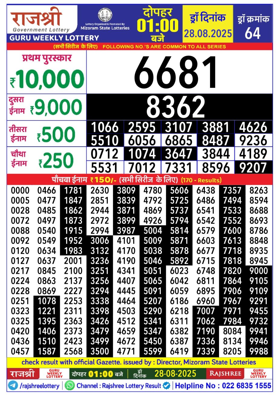 Rajshree Lottery Result 1PM 28.08.25 Share: XFacebookPinterestRedditVKDiggLinkedinMix Related Results Rajshree Lottery Result 1PM 26.10.25 Rajshree Lottery Result 1PM 25.10.25 Rajshree Lottery Result 1PM 24.10.25 Rajshree Lottery Result 1PM 23.10.25