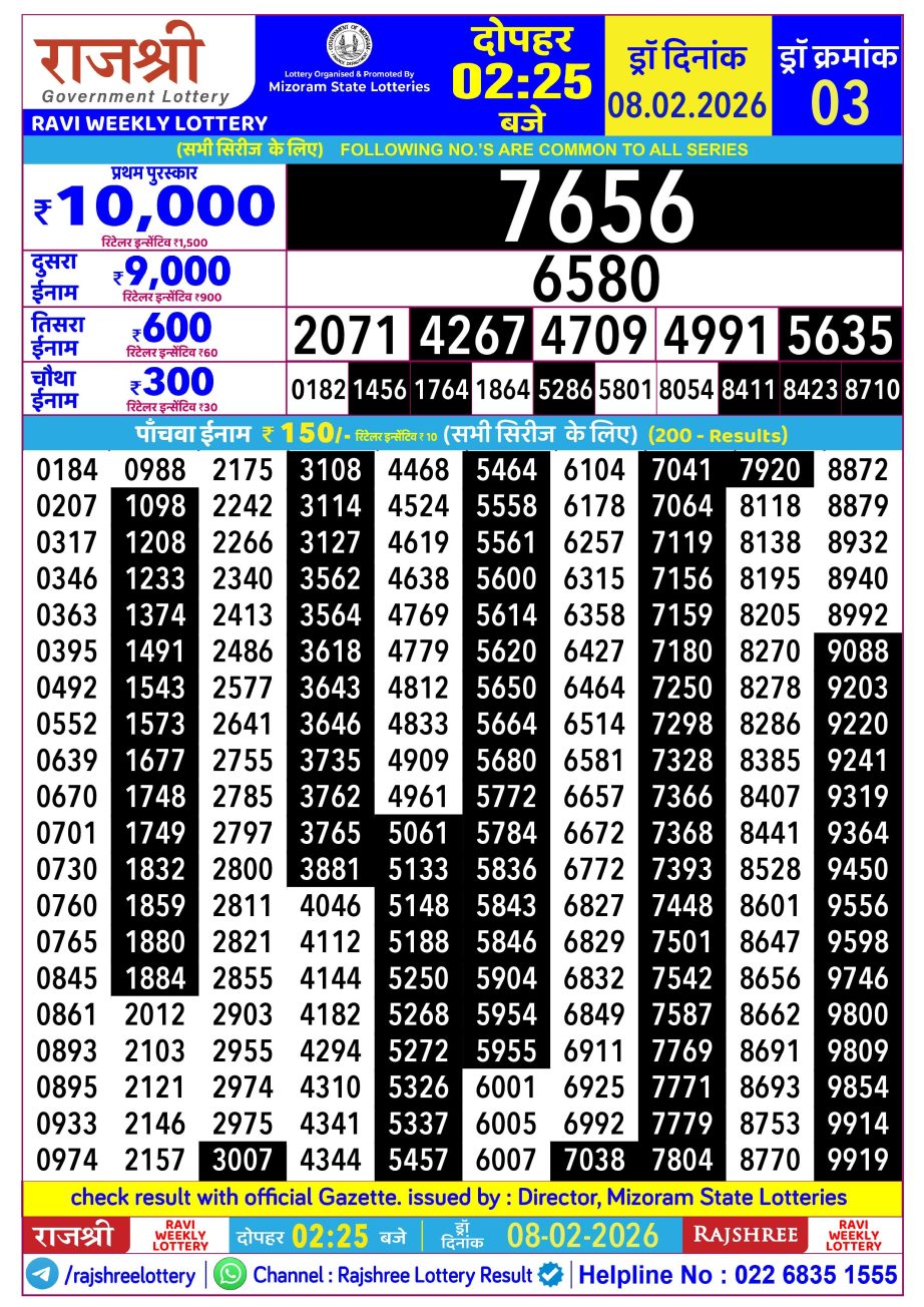 Rajshree Lottery Result 2.25PM 08.02.26 Share: XFacebookPinterestRedditVKDiggLinkedinMix Related Results Rajshree Lottery Result 2.25PM 09.02.26 Rajshree Lottery Result 2.25PM 07.02.26 Rajshree Lottery Result 2.25PM 06.02.26 Rajshree Lottery Result 2.25PM 05.02.26