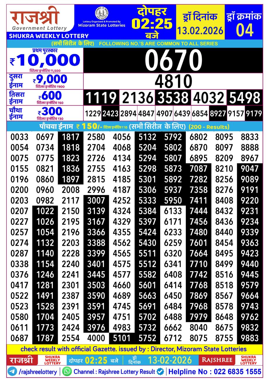 Rajshree Lottery Result 2.25PM 13.02.26 Share: XFacebookPinterestRedditVKDiggLinkedinMix Related Results Rajshree Lottery Result 2.25PM 03.03.26 Rajshree Lottery Result 2.25PM 02.03.26 Rajshree Lottery Result 2.25PM 01.03.26 Rajshree Lottery Result 2.25PM 28.02.26