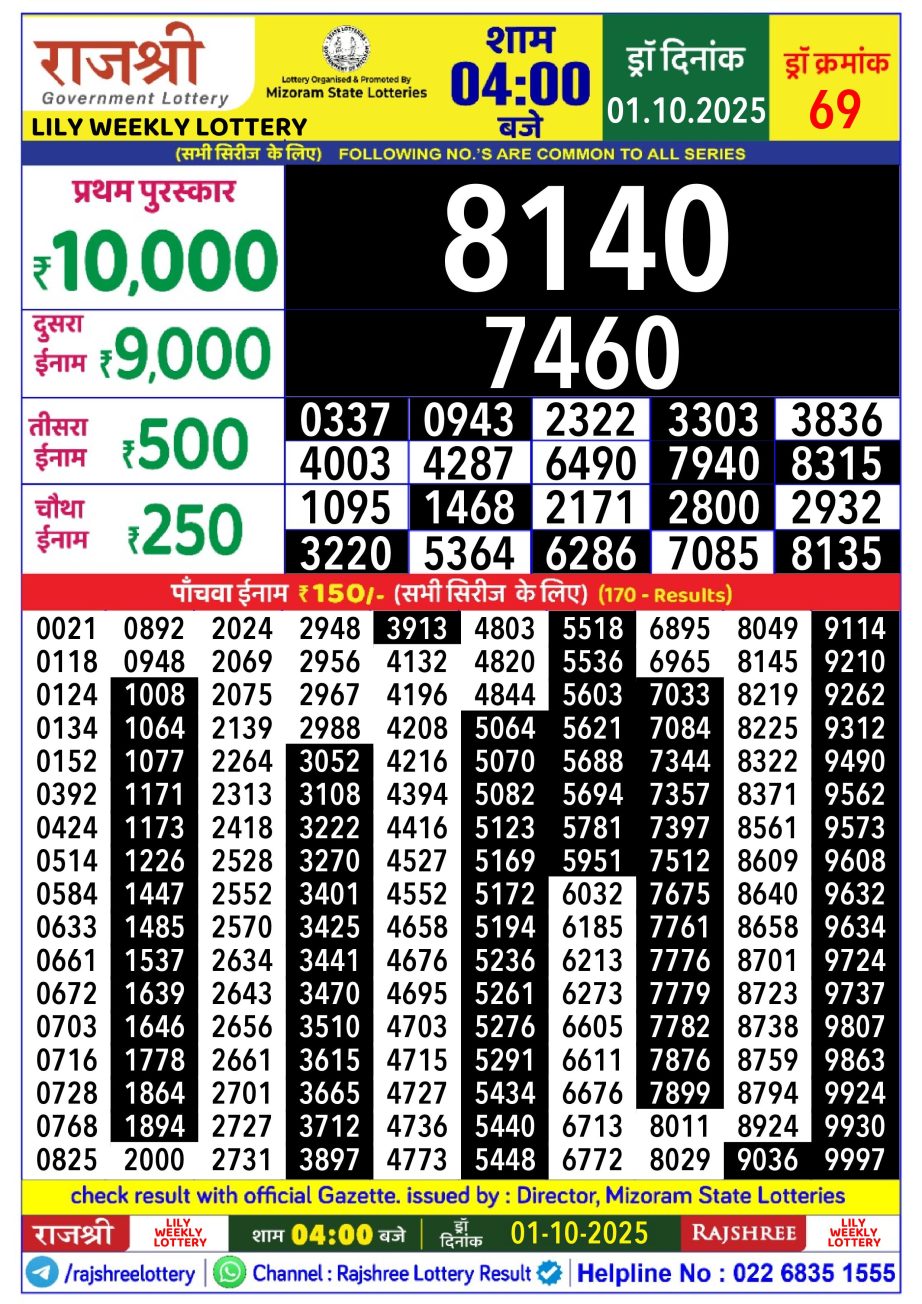 Rajshree Lottery Result 4PM 01.10.25 Share: XFacebookPinterestRedditVKDiggLinkedinMix Related Results Rajshree Lottery Result 4PM 14.12.25 Rajshree Lottery Result 4PM 13.12.25 Rajshree Lottery Result 4PM 12.12.25 Rajshree Lottery Result 4PM 11.12.25