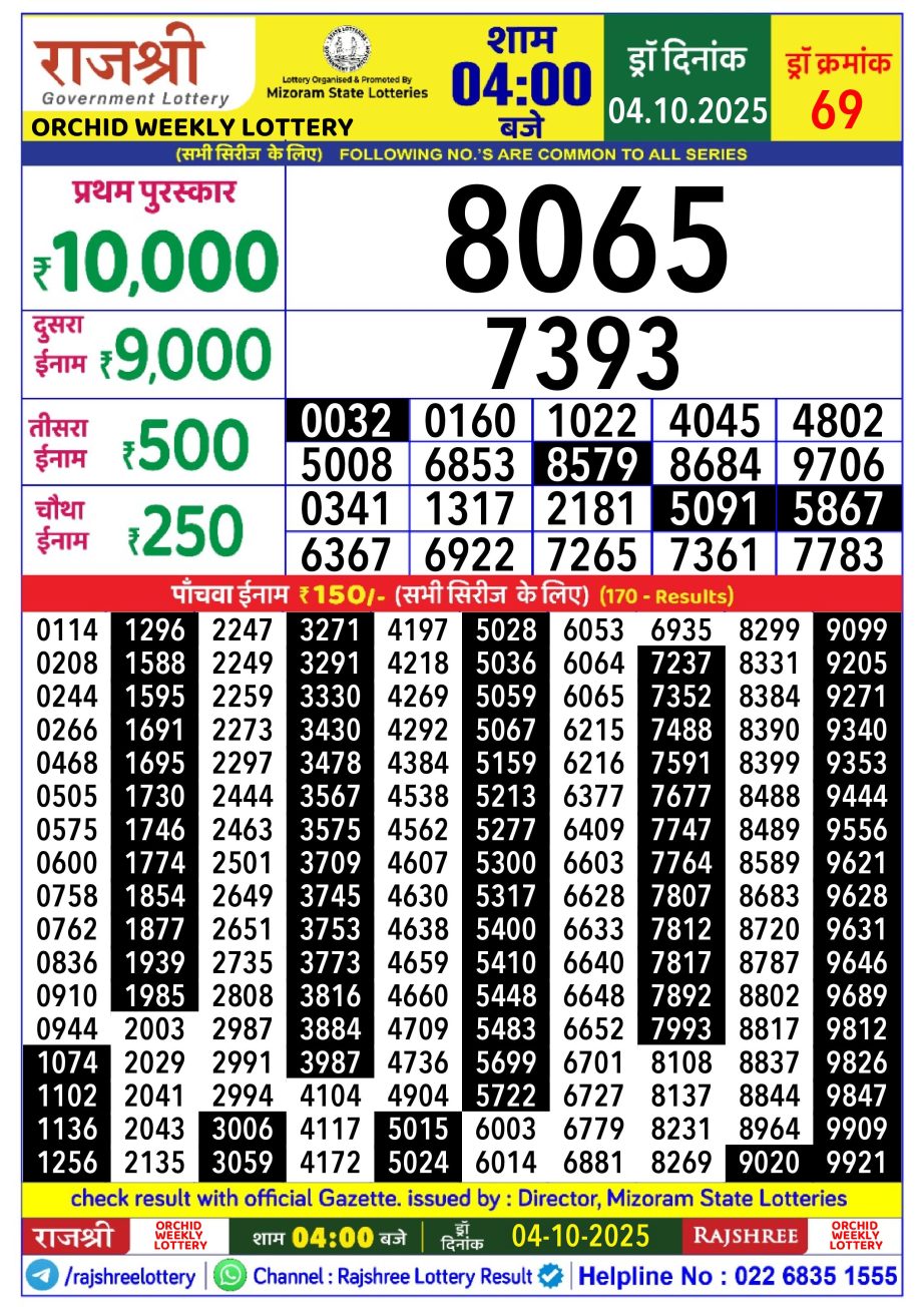 Rajshree Lottery Result 4PM 04.10.25 Share: XFacebookPinterestRedditVKDiggLinkedinMix Related Results Rajshree Lottery Result 4PM 13.10.25 Rajshree Lottery Result 4PM 12.10.25 Rajshree Lottery Result 4PM 11.10.25 Rajshree Lottery Result 4PM 10.10.25