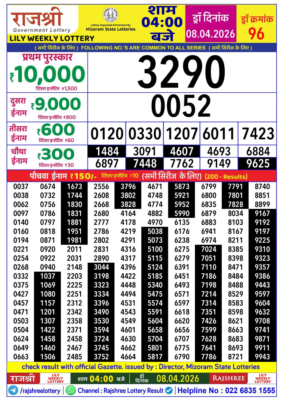 Rajshree Lottery Result 4PM 08.04.26 Share: XFacebookPinterestRedditVKDiggLinkedinMix Related Results Rajshree Lottery Result 4PM 07.04.26 Rajshree Lottery Result 4PM 06.04.26 Rajshree Lottery Result 4PM 05.04.26 Rajshree Lottery Result 4PM 04.04.26