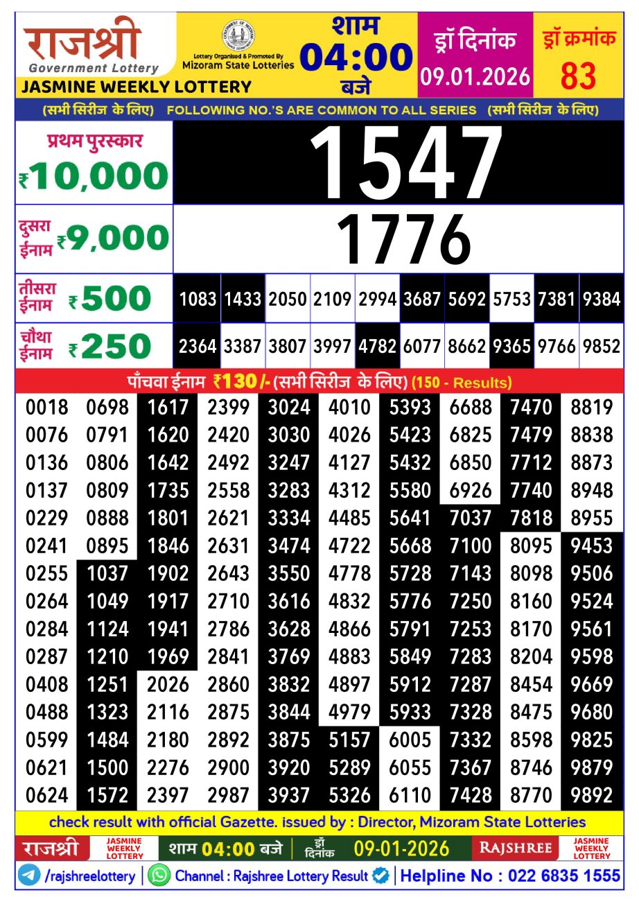 Rajshree Lottery Result 4PM 09.01.26 Share: XFacebookPinterestRedditVKDiggLinkedinMix Related Results Rajshree Lottery Result 4PM 16.01.26 Rajshree Lottery Result 4PM 15.01.26 Rajshree Lottery Result 4PM 14.01.26 Rajshree Lottery Result 4PM 13.01.26