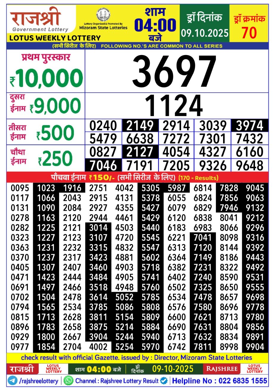 Rajshree Lottery Result 4PM 09.10.25 Share: XFacebookPinterestRedditVKDiggLinkedinMix Related Results Rajshree Lottery Result 4PM 13.10.25 Rajshree Lottery Result 4PM 12.10.25 Rajshree Lottery Result 4PM 11.10.25 Rajshree Lottery Result 4PM 10.10.25