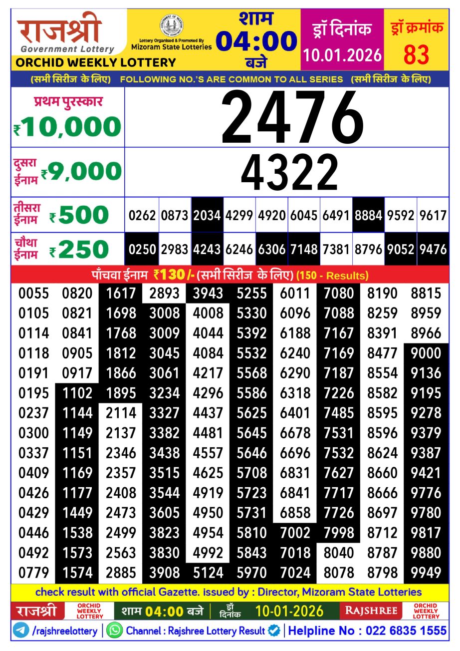 Rajshree Lottery Result 4PM 10.01.26 Share: XFacebookPinterestRedditVKDiggLinkedinMix Related Results Rajshree Lottery Result 4PM 16.01.26 Rajshree Lottery Result 4PM 15.01.26 Rajshree Lottery Result 4PM 14.01.26 Rajshree Lottery Result 4PM 13.01.26