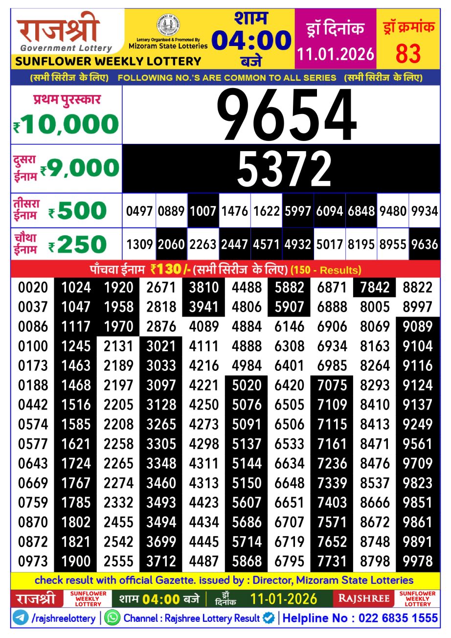 Rajshree Lottery Result 4PM 11.01.26 Share: XFacebookPinterestRedditVKDiggLinkedinMix Related Results Rajshree Lottery Result 4PM 16.01.26 Rajshree Lottery Result 4PM 15.01.26 Rajshree Lottery Result 4PM 14.01.26 Rajshree Lottery Result 4PM 13.01.26