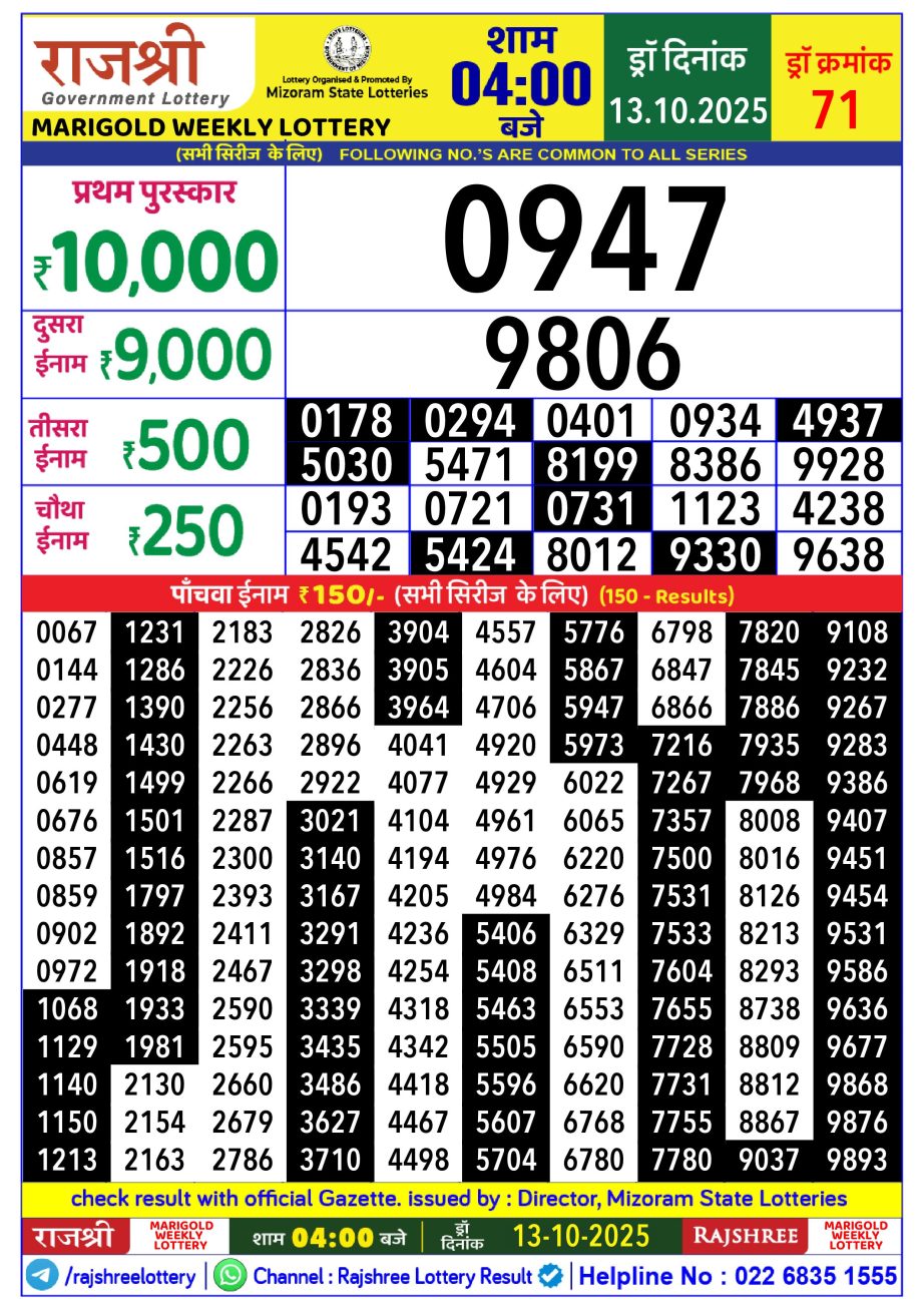Rajshree Lottery Result 4PM 13.10.25 Share: XFacebookPinterestRedditVKDiggLinkedinMix Related Results Rajshree Lottery Result 4PM 14.12.25 Rajshree Lottery Result 4PM 13.12.25 Rajshree Lottery Result 4PM 12.12.25 Rajshree Lottery Result 4PM 11.12.25