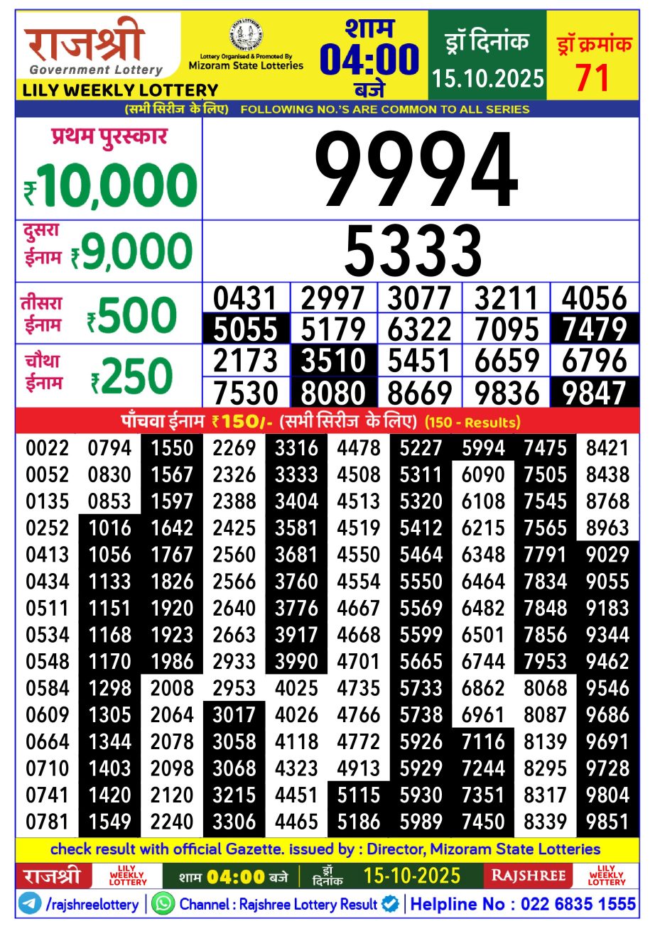 Rajshree Lottery Result 4PM 15.10.25 Share: XFacebookPinterestRedditVKDiggLinkedinMix Related Results Rajshree Lottery Result 4PM 14.12.25 Rajshree Lottery Result 4PM 13.12.25 Rajshree Lottery Result 4PM 12.12.25 Rajshree Lottery Result 4PM 11.12.25