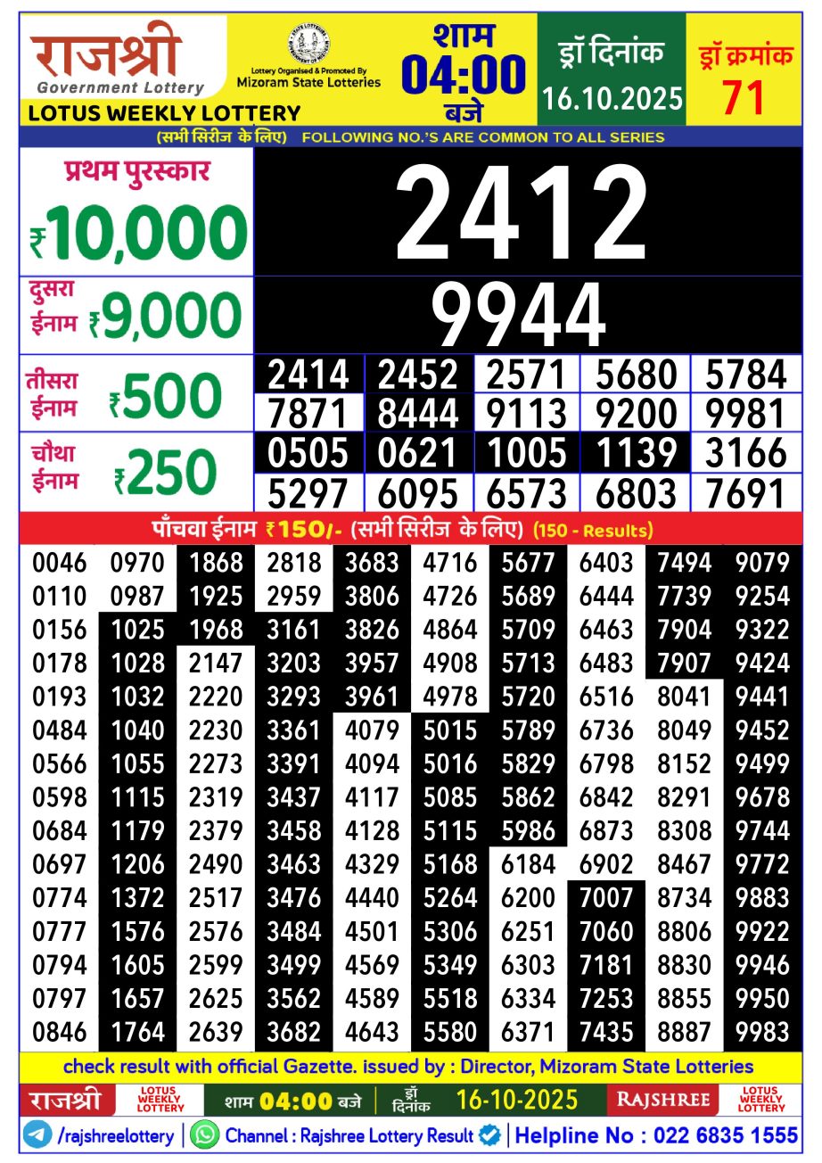 Rajshree Lottery Result 4PM 16.10.25 Share: XFacebookPinterestRedditVKDiggLinkedinMix Related Results Rajshree Lottery Result 4PM 14.12.25 Rajshree Lottery Result 4PM 13.12.25 Rajshree Lottery Result 4PM 12.12.25 Rajshree Lottery Result 4PM 11.12.25