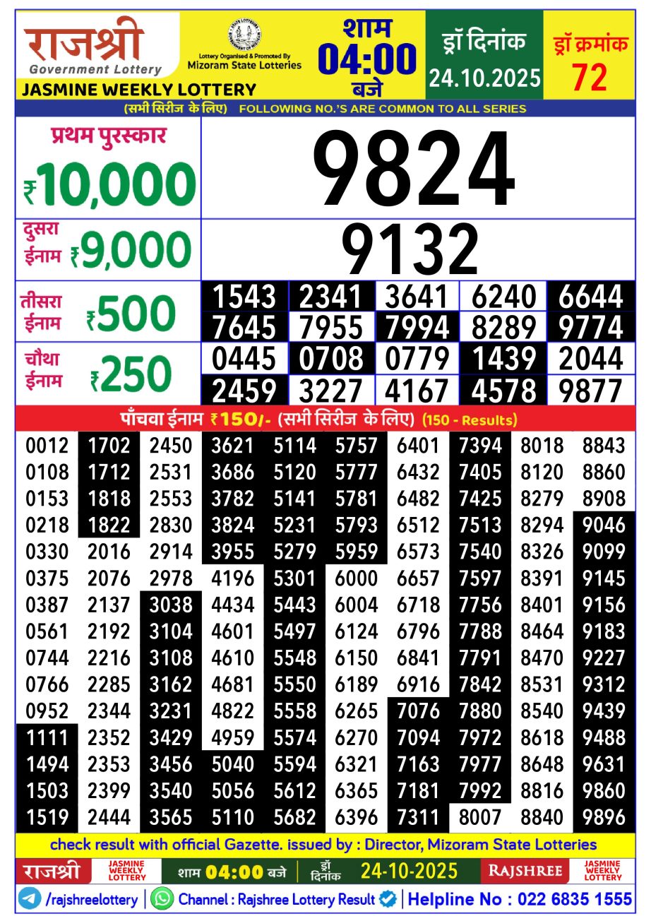 Rajshree Lottery Result 4PM 24.10.25 Share: XFacebookPinterestRedditVKDiggLinkedinMix Related Results Rajshree Lottery Result 4PM 23.10.25 Rajshree Lottery Result 4PM 22.10.25 Rajshree Lottery Result 4PM 21.10.25 Rajshree Lottery Result 4PM 20.10.25