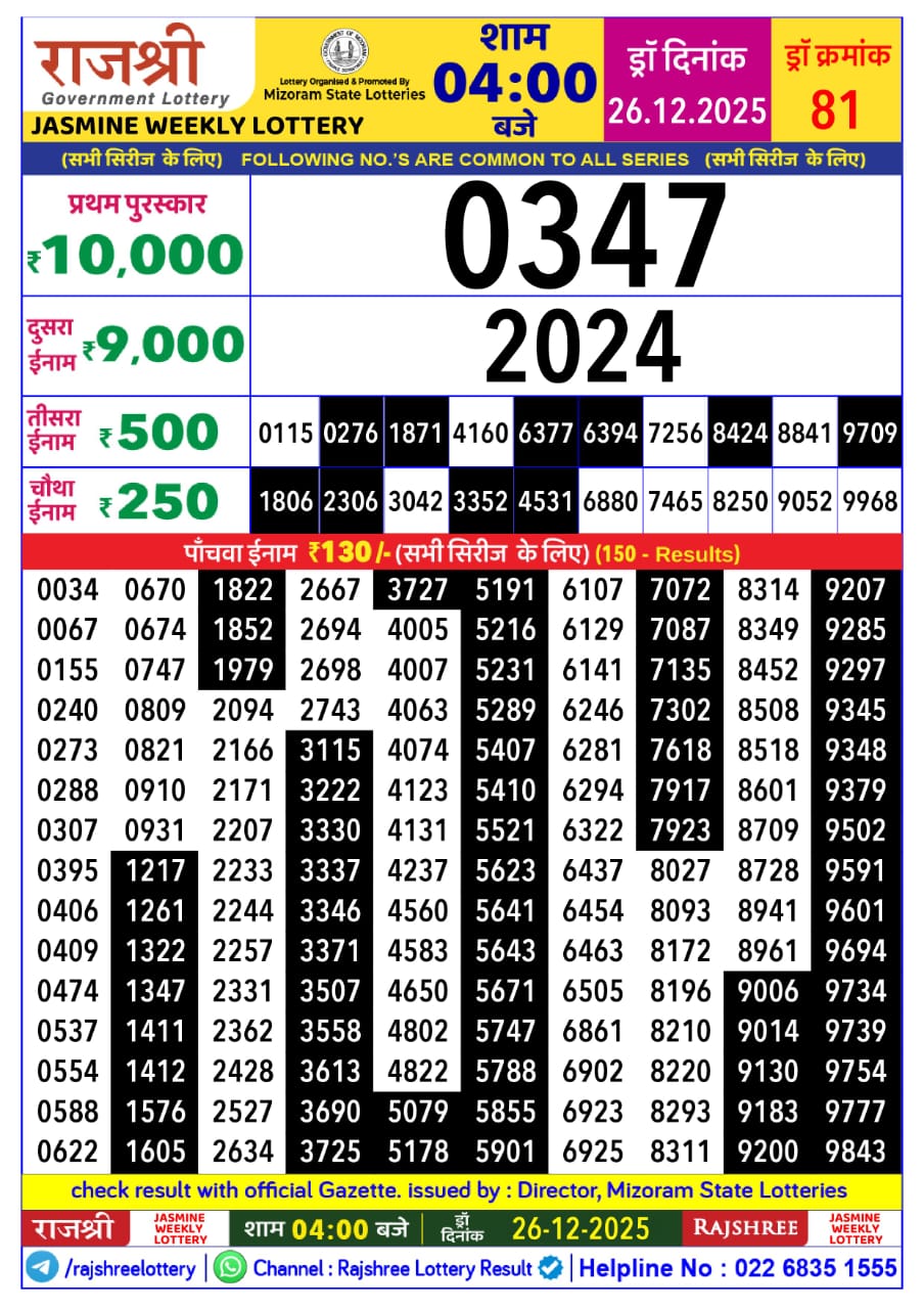 Rajshree Lottery Result 4PM 26.12.25 Share: XFacebookPinterestRedditVKDiggLinkedinMix Related Results Rajshree Lottery Result 4PM 16.01.26 Rajshree Lottery Result 4PM 15.01.26 Rajshree Lottery Result 4PM 14.01.26 Rajshree Lottery Result 4PM 13.01.26
