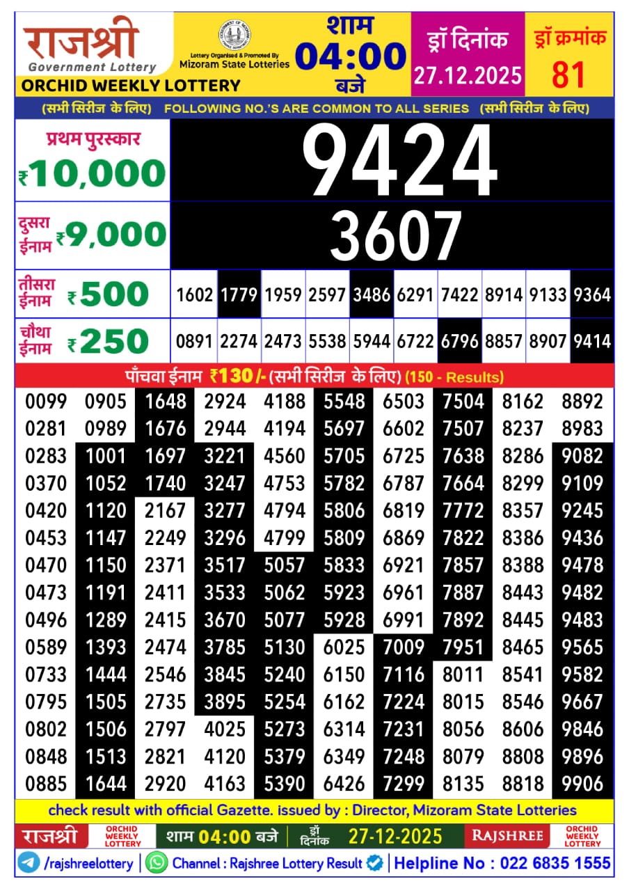 Rajshree Lottery Result 4PM 27.12.25 Share: XFacebookPinterestRedditVKDiggLinkedinMix Related Results Rajshree Lottery Result 4PM 16.01.26 Rajshree Lottery Result 4PM 15.01.26 Rajshree Lottery Result 4PM 14.01.26 Rajshree Lottery Result 4PM 13.01.26