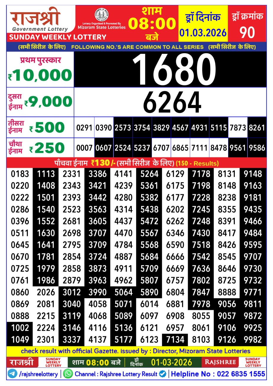 Rajshree Lottery Result 8PM 01.03.26 Share: XFacebookPinterestRedditVKDiggLinkedinMix Related Results Rajshree Lottery Result 8PM 02.03.26 Rajshree Lottery Result 8PM 28.02.26 Rajshree Lottery Result 8PM 27.02.26 Rajshree Lottery Result 8PM 26.02.26