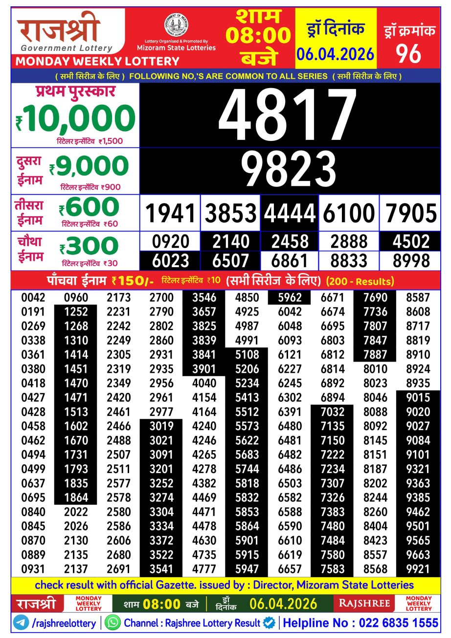 Rajshree Lottery Result 8PM 06.04.26 Share: XFacebookPinterestRedditVKDiggLinkedinMix Related Results Rajshree Lottery Result 8PM 07.04.26 Rajshree Lottery Result 8PM 05.04.26 Rajshree Lottery Result 8PM 04.04.26 Rajshree Lottery Result 8PM 03.04.26