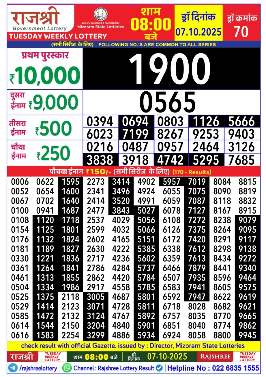 Rajshree Lottery Result 8PM 07.10.25 Share: XFacebookPinterestRedditVKDiggLinkedinMix Related Results Rajshree Lottery Result 8PM 13.10.25 Rajshree Lottery Result 8PM 12.10.25 Rajshree Lottery Result 8PM 11.10.25 Rajshree Lottery Result 8PM 10.10.25