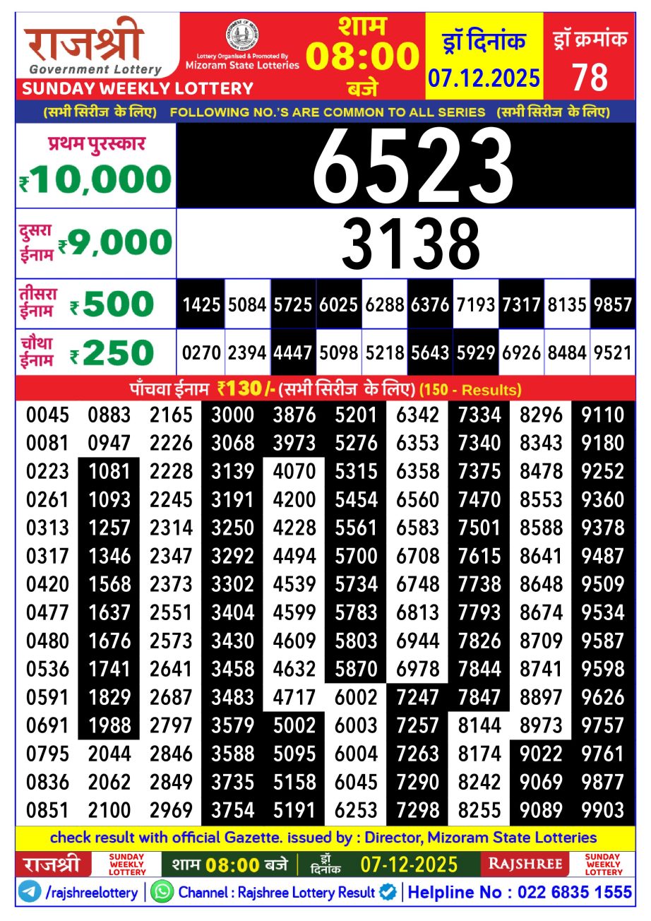 Rajshree Lottery Result 8PM 07.12.25 Share: XFacebookPinterestRedditVKDiggLinkedinMix Related Results Rajshree Lottery Result 8PM 14.12.25 Rajshree Lottery Result 8PM 13.12.25 Rajshree Lottery Result 8PM 12.12.25 Rajshree Lottery Result 8PM 11.12.25