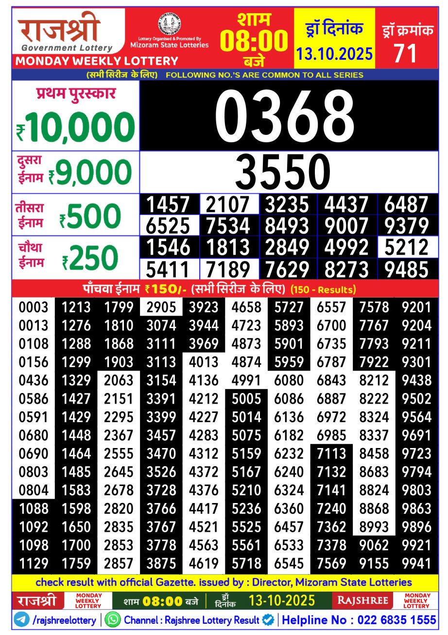 Rajshree Lottery Result 8PM 13.10.25 Share: XFacebookPinterestRedditVKDiggLinkedinMix Related Results Rajshree Lottery Result 8PM 14.12.25 Rajshree Lottery Result 8PM 13.12.25 Rajshree Lottery Result 8PM 12.12.25 Rajshree Lottery Result 8PM 11.12.25