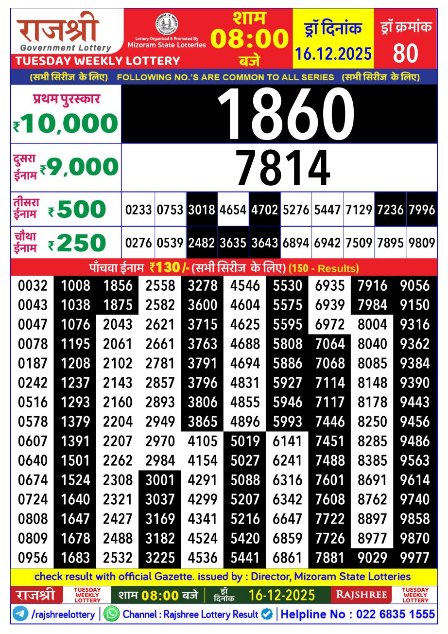 Rajshree Lottery Result 8PM 16.12.25 Share: XFacebookPinterestRedditVKDiggLinkedinMix Related Results Rajshree Lottery Result 8PM 10.02.26 Rajshree Lottery Result 8PM 09.02.26 Rajshree Lottery Result 8PM 08.02.26 Rajshree Lottery Result 8PM 07.02.26