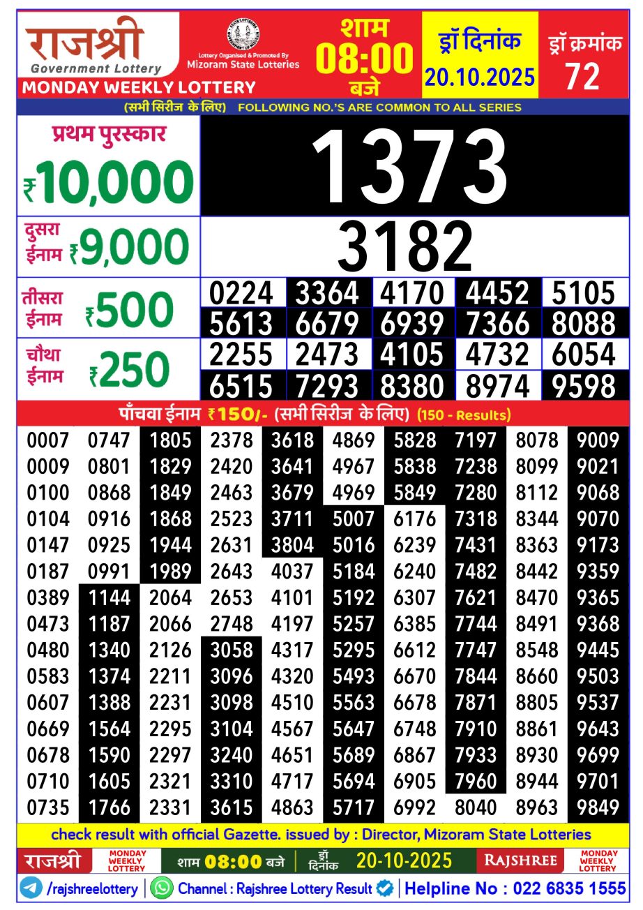 Rajshree Lottery Result 8PM 20.10.25 Share: XFacebookPinterestRedditVKDiggLinkedinMix Related Results Rajshree Lottery Result 8PM 14.12.25 Rajshree Lottery Result 8PM 13.12.25 Rajshree Lottery Result 8PM 12.12.25 Rajshree Lottery Result 8PM 11.12.25
