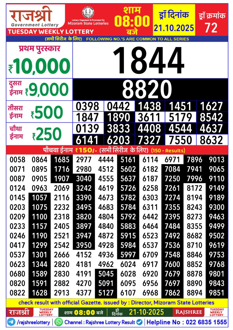 Rajshree Lottery Result 8PM 21.10.25 Share: XFacebookPinterestRedditVKDiggLinkedinMix Related Results Rajshree Lottery Result 8PM 14.12.25 Rajshree Lottery Result 8PM 13.12.25 Rajshree Lottery Result 8PM 12.12.25 Rajshree Lottery Result 8PM 11.12.25