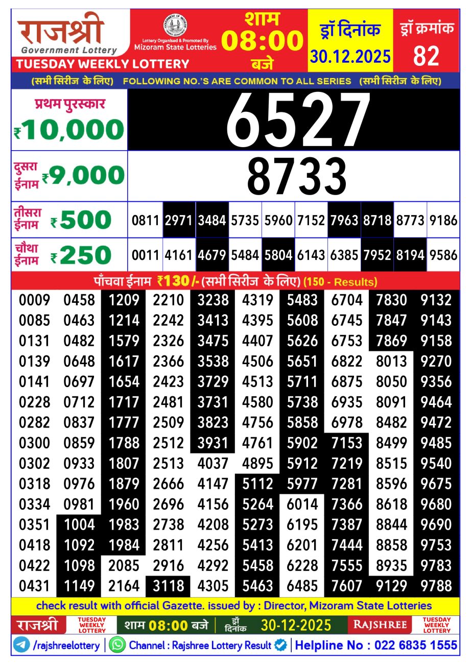 Rajshree Lottery Result 8PM 30.12.25 Share: XFacebookPinterestRedditVKDiggLinkedinMix Related Results Rajshree Lottery Result 8PM 16.01.26 Rajshree Lottery Result 8PM 15.01.26 Rajshree Lottery Result 8PM 14.01.26 Rajshree Lottery Result 8PM 13.01.26