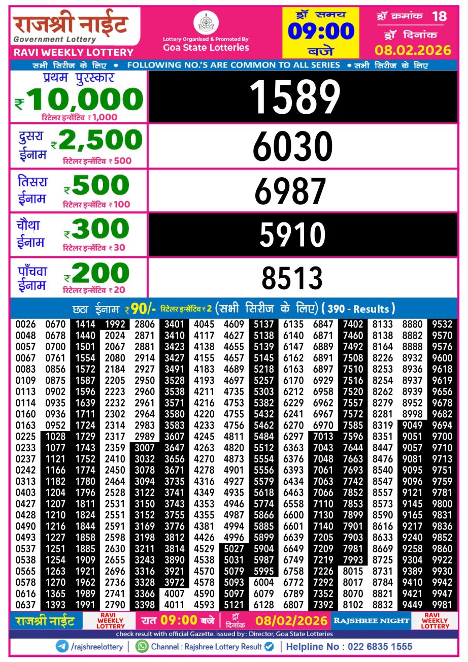 Rajshree Night Lottery Result 9pm 08.02.26 Share: XFacebookPinterestRedditVKDiggLinkedinMix Related Results Rajshree Night Lottery Result 9pm 09.02.26 Rajshree Night Lottery Result 9pm 07.02.26 Rajshree Night Lottery Result 9pm 06.02.26 Rajshree Night Lottery Result 9pm 05.02.26