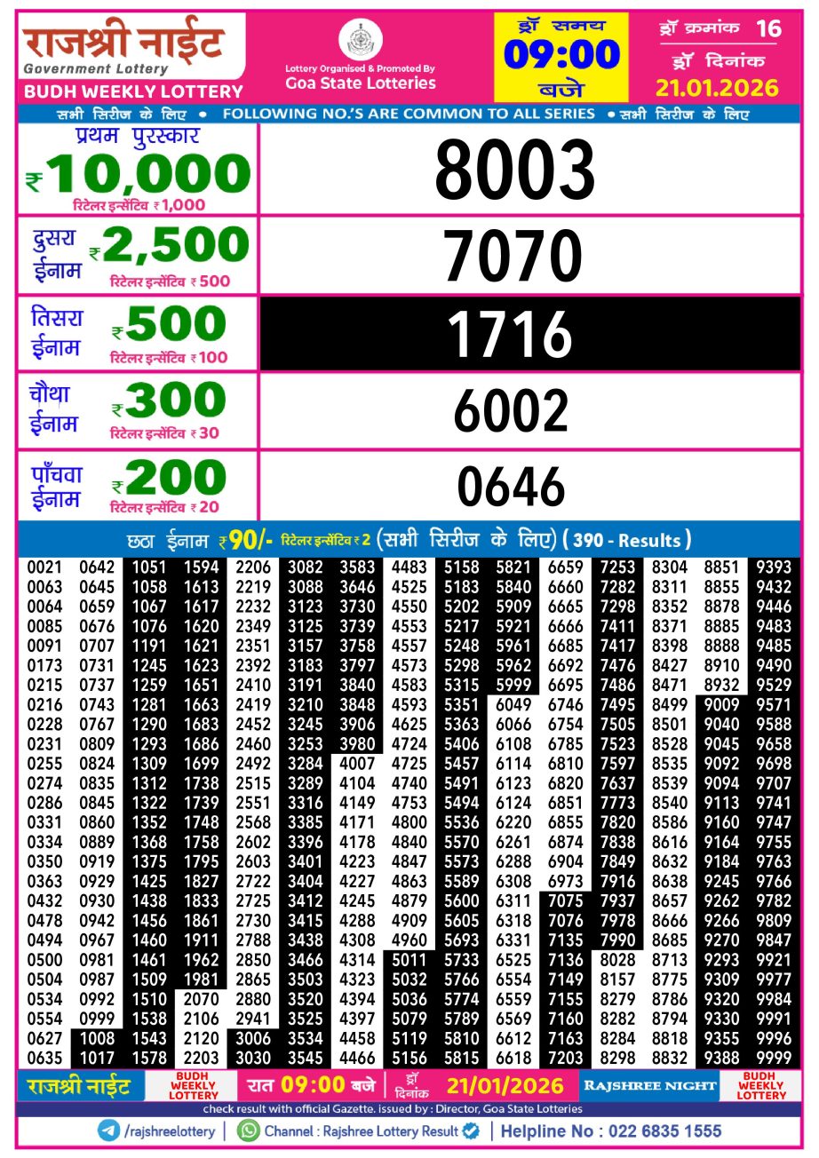 Rajshree Night Lottery Result 9pm 21.01.26 Share: XFacebookPinterestRedditVKDiggLinkedinMix Related Results Rajshree Night Lottery Result 9pm 10.02.26 Rajshree Night Lottery Result 9pm 09.02.26 Rajshree Night Lottery Result 9pm 08.02.26 Rajshree Night Lottery Result 9pm 07.02.26