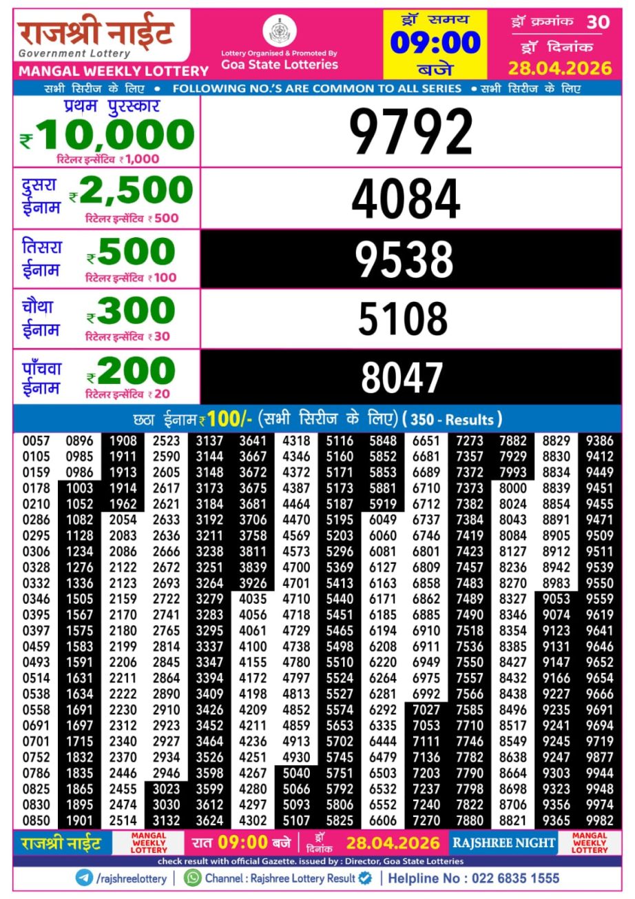 Rajshree Night Lottery Result 9pm 28.04.26 Share: XFacebookPinterestRedditVKDiggLinkedinMix Related Results Rajshree Night Lottery Result 9pm 30.04.26 Rajshree Night Lottery Result 9pm 29.04.26 Rajshree Night Lottery Result 9pm 27.04.26 Rajshree Night Lottery Result 9pm 26.04.26